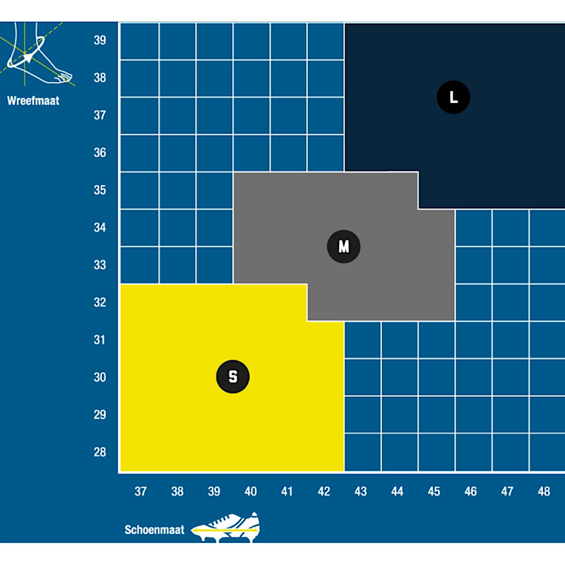 De Push Sports Enkelbrace Kicx is verkrijgbaar in drie maten in een linker- en rechteruitvoering. Kies de juiste bracemaat op basis van je wreefomtrek en je schoenmaat.